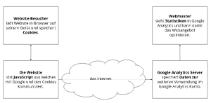 Das folgende Beispiel zeigt schematisch die Funktionsweise von Google Analytics als Beispiel für client-basiertes Webtracking mit Java-Script-Code.